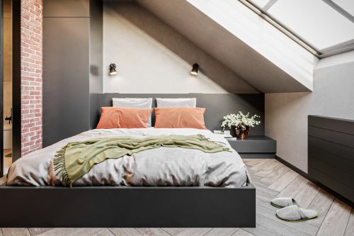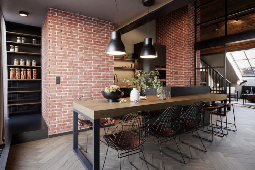 Industriální byt vznikl z developerského projektu 3 bytů v podkroví v Praze na Andělu. Každý byt je laděn do jiného tématu. Tento je industriální. Byty mají samy o sobě krásnou dispozici s vysokými stropy do podkroví. V podkroví se nachází malá galerie s pracovnou. Industriální styl se ke struktuře bytu vysloveně nabízel a zcela přirozeně si ho podmanil.