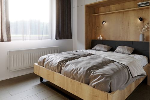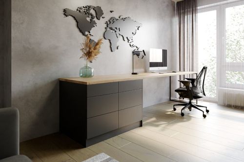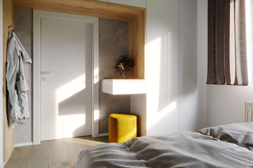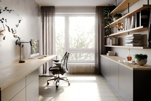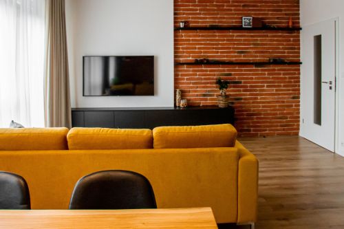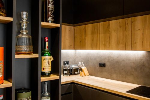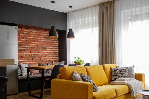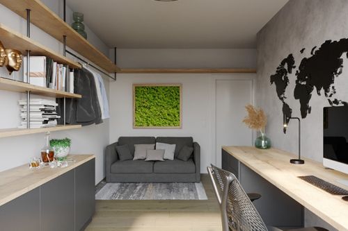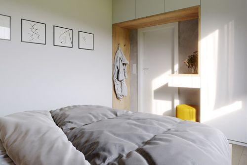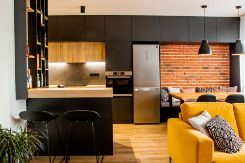 Interiér bytu se nese v industriálním stylu, který si klienti zamilovali ještě před tím, než nás oslovili. Hlavním navrhovaným prostorem byl obývací pokoj s kuchyňským koutem a vstupní hala. Ačkoliv plocha obývacího pokoje není příliš velká, požadavky zněly jasně – velká pracovní plocha v kuchyni s barovým sezením, jídelní stůl pro šest lidí a rozkládací pohovka. Vše je vyřešeno správně zvoleným nábytkem a na míru řešenou kuchyní, která přechází do sedací lavice k jídelnímu stolu. Industriální styl je znázorněn antracitovým nábytkem v kombinaci s červeným cihlovým obkladem a dřevem, černými světly a kovovými detaily. Rohový vstupní prostor je propojen nízkým antracitovým botníkem, který přechází do velkého úložného prostoru na kola. Pro optické zvětšení prostoru je zde umístěno vysoké zrcadlo a bílé šatní skříně.
