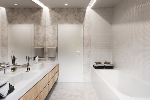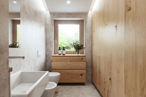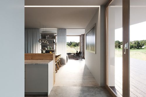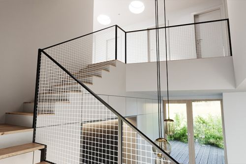 V rámci tohoto projektu jsme navrhovaly jak interiér, tak i dům samotný, jak jinak, než v pasivním standartu. Tak tedy vznikl návrh domu pro mladou rodinu. Ačkoliv se dům nachází v památkově regulované oblasti, majitelé chtěli moderní dům včetně interiéru. Hlavní dominantou interiéru je velká vstupní hala, která je otevřena do druhého podlaží pomocí velkorysého schodiště. Zároveň je skrz schodiště významný průhled od vstupu až na zahradu. Na vstupní halu navazuje příjemný obývací pokoj, který je předělen na kuchyňskou a obývací část pomocí lehkých závěsů a skleněné stěny. Součástí návrhu jsou i čtyři koupelny, které se v domě nachází. Jsou řešeny převážně ve světlých barvách s akcenty dřeva.