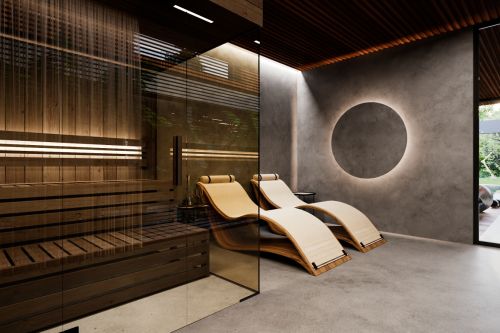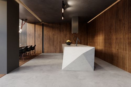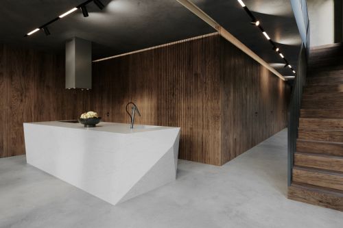 Interiér vily vznikal společně s návrhem celého domu. Klienti měli jasnou představu o tom, jak by měl být interiér laděný. Přáli si tmavší materiály, spolu s tmavším hladkým dřevem, stěrkovu a dřevěnou podlahou. Stěny neměly být bílé. Každá stěny domu je obložena, zakryta nábytkem nebo opatřeba stěrkou.