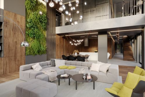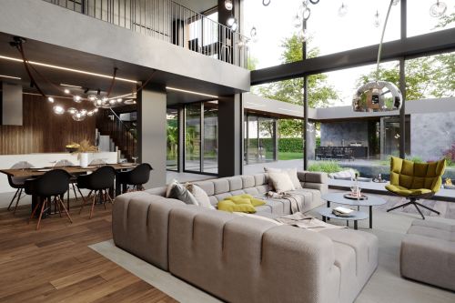 Dominantou interiéru je obývací pokoj s výškou 7 metrů. Uprostřed dispozice domu se nachází zelené atrium.