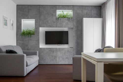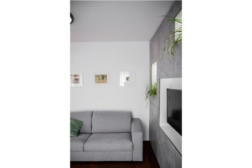 Výzvou návrhu jednopokojového bytu je vždy vtěsnat do jedné místnosti několik funkcí. Jedná se o odpočinkovou – noční a pobytovou – denní. V tomto případě byla situace trochu usnadněna tím, že pokoj sám o sobě je tvaru písmene L a umožňuje vytvořit 2 prostory, které nesou svoji vlastní funkci. Je to ložnice a obývací pokoj. Design interiéru jako takového se nesl v trendy, hravém konceptu. Důležitým prvkem jsou textilie, které v tomto případě hrají velkou roli i v návrhu nábytku na míru. Za postelí (taktéž navržené na míru) se nachází čalouněné čelo v celé šíři místnosti, stěna s okny je celá zjemněna závěsy a záclonami, které pomohly stěnu sjednotit, protože se zde nachází několik různě umístěných okének. Dalším důležitým prvkem interiéru je stěna v obývací části, která slouží jako úložný prostor. Dokonce je do ni vložena plnohodnotná skříň, která svou hmotou vystupuje před konstrukci dvířek v dekoru betonu. Ve stěně jsou integrovány niky s rostlinami, které jsou zvýrazněny LED osvětlením.