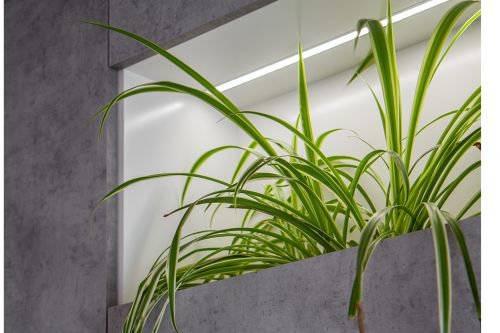 Světla jsou v interiéru vybrána co nejjednodušší, ale výrazné antracitové barvy. Součástí nábytků na míru jsou LED pásky, které podsvětlují nebo naopak zvýrazňují důležité tvary.