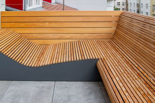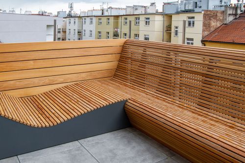 Součástí rekonstrukce malého bytu je i terasa, které jsme dali úplně nový vzhled laťovým nábytkem, který je pohodlnou lavicí a lehátkem zároveň. Součástí konstrukce je i podlouhlý květináč v místě zábradlí.
