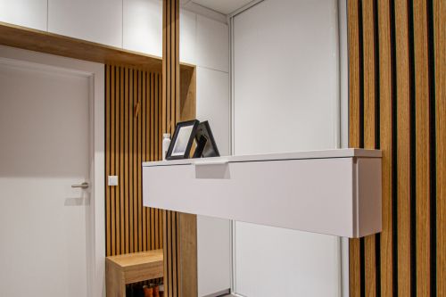Důležitým motivem interiéru se staly dubové latě, kterými jsme obložili stěny v zádveří a kuchyni. V zádveří byla ponechána původní vestavěná skříň, které jsme vyměnili dveře. Další nábytek už byl řešen na míru vestavbou z bílého lamina a z lamina imitujícího dubové dřevo. Kuchyně byla původně navržena ze systému z obchodního domu Ikea, nicméně nakonec se výroby chopili truhláři, kteří pak vytvořili i nábytek na míru v obývacím pokoji.