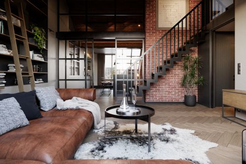 Industriální byt vznikl z developerského projektu 3 bytů v podkroví v Praze na Andělu. Každý byt je laděn do jiného tématu. Tento je industriální. Byty mají samy o sobě krásnou dispozici s vysokými stropy do podkroví. V podkroví se nachází malá galerie s pracovnou. Industriální styl se ke struktuře bytu vysloveně nabízel a zcela přirozeně si ho podmanil.