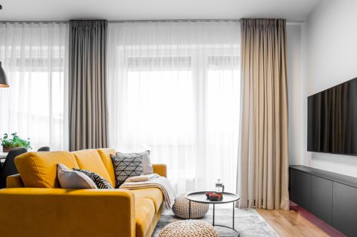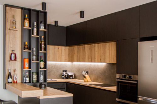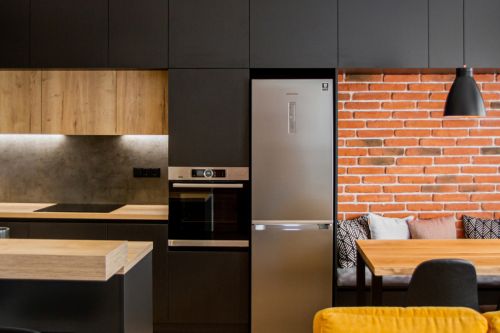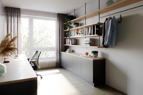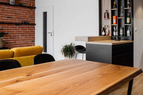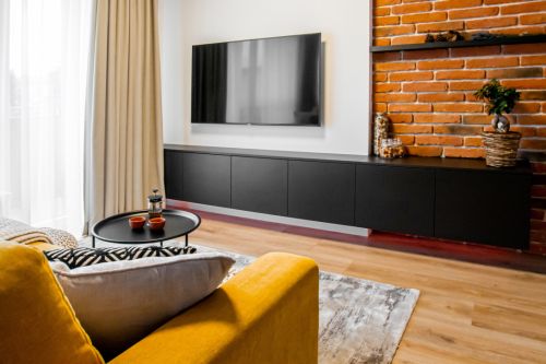 Interiér bytu se nese v industriálním stylu, který si klienti zamilovali ještě před tím, než nás oslovili. Hlavním navrhovaným prostorem byl obývací pokoj s kuchyňským koutem a vstupní hala. Ačkoliv plocha obývacího pokoje není příliš velká, požadavky zněly jasně – velká pracovní plocha v kuchyni s barovým sezením, jídelní stůl pro šest lidí a rozkládací pohovka. Vše je vyřešeno správně zvoleným nábytkem a na míru řešenou kuchyní, která přechází do sedací lavice k jídelnímu stolu. Industriální styl je znázorněn antracitovým nábytkem v kombinaci s červeným cihlovým obkladem a dřevem, černými světly a kovovými detaily. Rohový vstupní prostor je propojen nízkým antracitovým botníkem, který přechází do velkého úložného prostoru na kola. Pro optické zvětšení prostoru je zde umístěno vysoké zrcadlo a bílé šatní skříně.