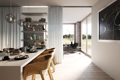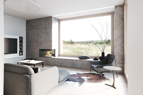 V rámci tohoto projektu jsme navrhovaly jak interiér, tak i dům samotný, jak jinak, než v pasivním standartu. Tak tedy vznikl návrh domu pro mladou rodinu. Ačkoliv se dům nachází v památkově regulované oblasti, majitelé chtěli moderní dům včetně interiéru. Hlavní dominantou interiéru je velká vstupní hala, která je otevřena do druhého podlaží pomocí velkorysého schodiště. Zároveň je skrz schodiště významný průhled od vstupu až na zahradu. Na vstupní halu navazuje příjemný obývací pokoj, který je předělen na kuchyňskou a obývací část pomocí lehkých závěsů a skleněné stěny. Součástí návrhu jsou i čtyři koupelny, které se v domě nachází. Jsou řešeny převážně ve světlých barvách s akcenty dřeva.