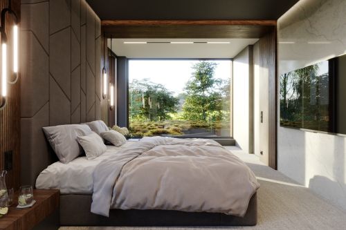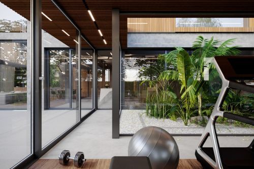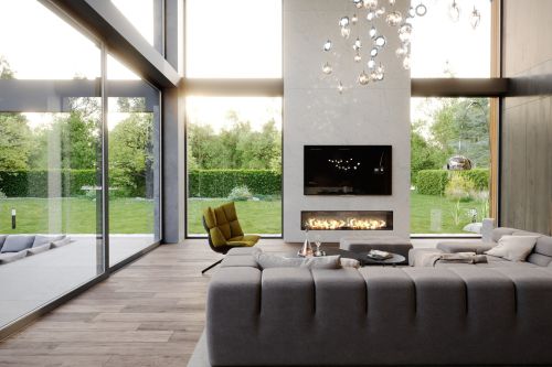Dominantou interiéru je obývací pokoj s výškou 7 metrů. Uprostřed dispozice domu se nachází zelené atrium.
