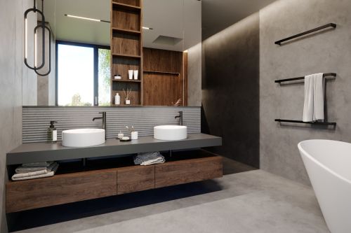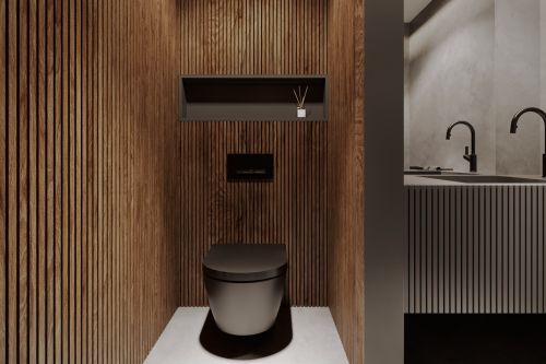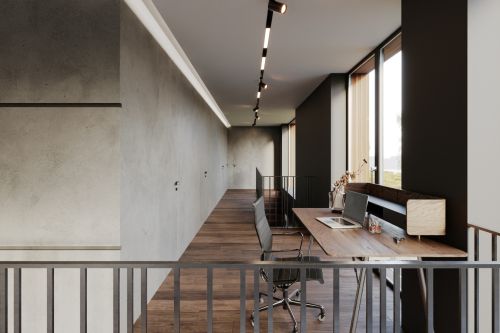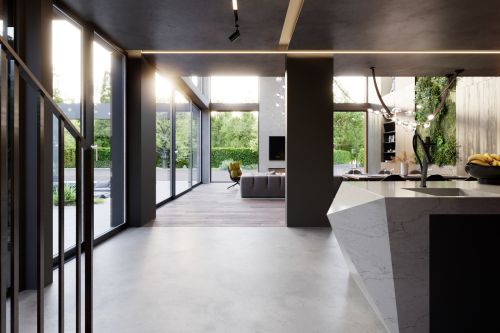 Interiér vily vznikal společně s návrhem celého domu. Klienti měli jasnou představu o tom, jak by měl být interiér laděný. Přáli si tmavší materiály, spolu s tmavším hladkým dřevem, stěrkovu a dřevěnou podlahou. Stěny neměly být bílé. Každá stěny domu je obložena, zakryta nábytkem nebo opatřeba stěrkou.
