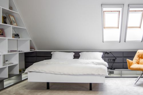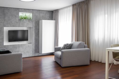 Výzvou návrhu jednopokojového bytu je vždy vtěsnat do jedné místnosti několik funkcí. Jedná se o odpočinkovou – noční a pobytovou – denní. V tomto případě byla situace trochu usnadněna tím, že pokoj sám o sobě je tvaru písmene L a umožňuje vytvořit 2 prostory, které nesou svoji vlastní funkci. Je to ložnice a obývací pokoj. Design interiéru jako takového se nesl v trendy, hravém konceptu. Důležitým prvkem jsou textilie, které v tomto případě hrají velkou roli i v návrhu nábytku na míru. Za postelí (taktéž navržené na míru) se nachází čalouněné čelo v celé šíři místnosti, stěna s okny je celá zjemněna závěsy a záclonami, které pomohly stěnu sjednotit, protože se zde nachází několik různě umístěných okének. Dalším důležitým prvkem interiéru je stěna v obývací části, která slouží jako úložný prostor. Dokonce je do ni vložena plnohodnotná skříň, která svou hmotou vystupuje před konstrukci dvířek v dekoru betonu. Ve stěně jsou integrovány niky s rostlinami, které jsou zvýrazněny LED osvětlením.