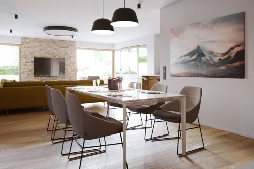 Ústředním bodem domu je obývací pokoj spojený s jídelnou a kuchyňským koutem. Jídelně dominuje velký bílý moderní stůl s pohodlnými čalouněnými židlemi a krb opatřený stěrkou. V obývací části je jasně žlutá rohová pohovka s nastavitelnými opěrkami hlavy, která barevně oživuje interiér. Televizní stěna je obložena stejným kamenným obkladem, který se vyskytuje v exteriéru. Kuchyňský kout je materiálově tvořen svěží kombinací betonu, dřeva a bílé barvy. Kuchyňský ostrůvek tvoří dělící linii mezi kuchyní a obývacím pokojem, kde slouží jako barový pult doplněný moderními barovými židličkami v hnědé kůži.